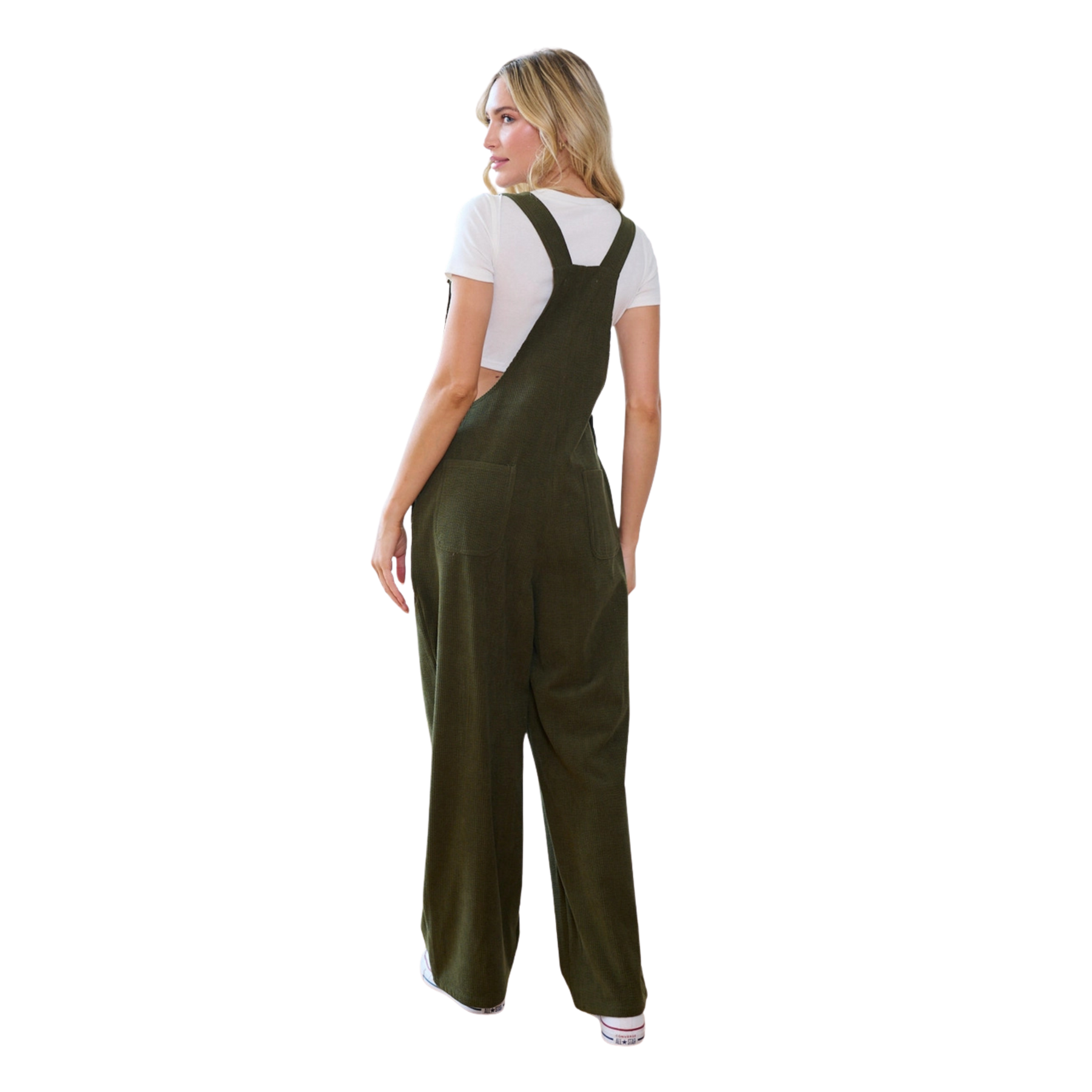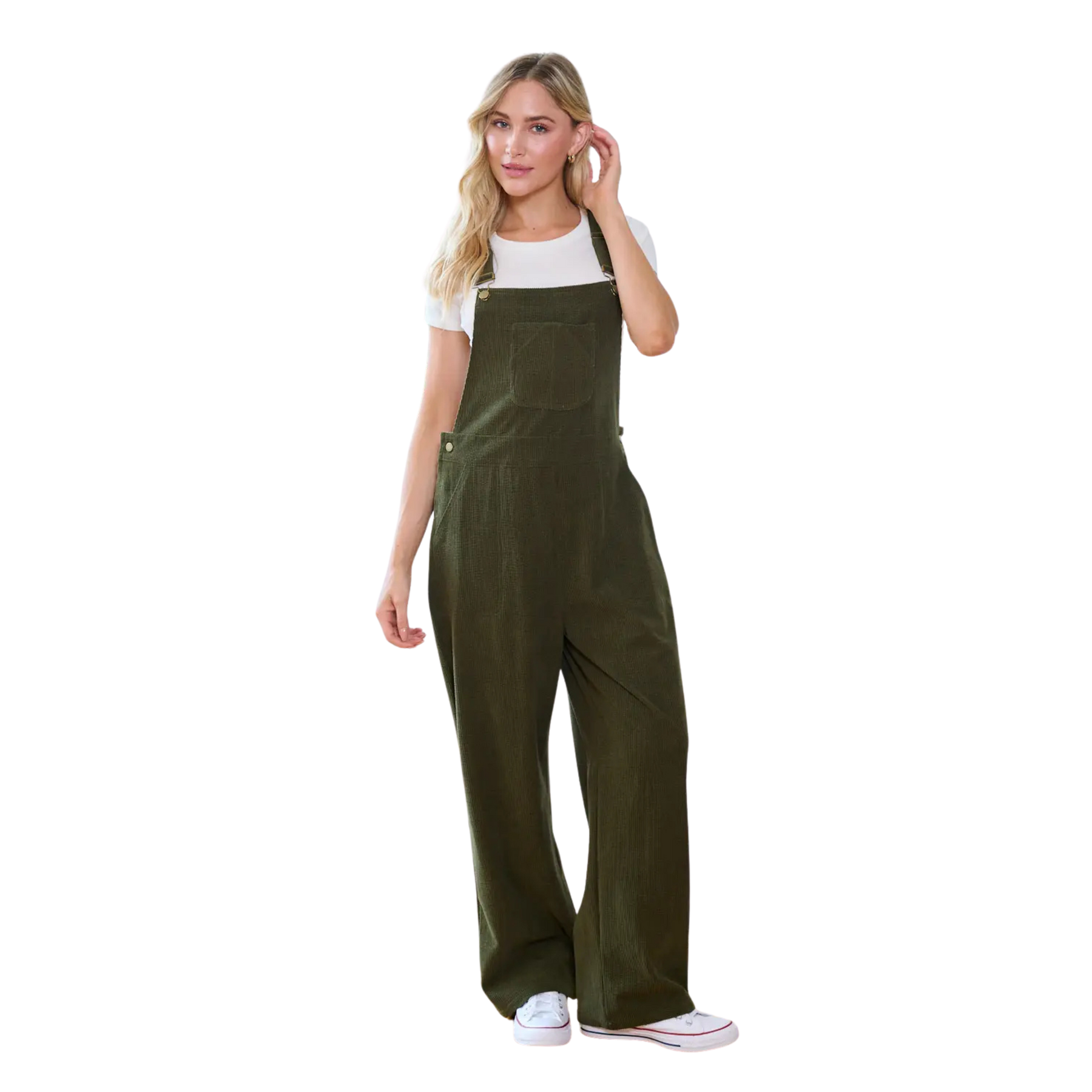 These are the kind of overalls you reach for when comfort and style need to coexist. Crafted from soft, olive green corduroy with a rich, tactile feel, this full-length pair brings an effortless, worn-in vibe to everyday dressing. The relaxed wide-leg silhouette and adjustable shoulder straps make them flattering, comfortable, and easy to layer through every season.