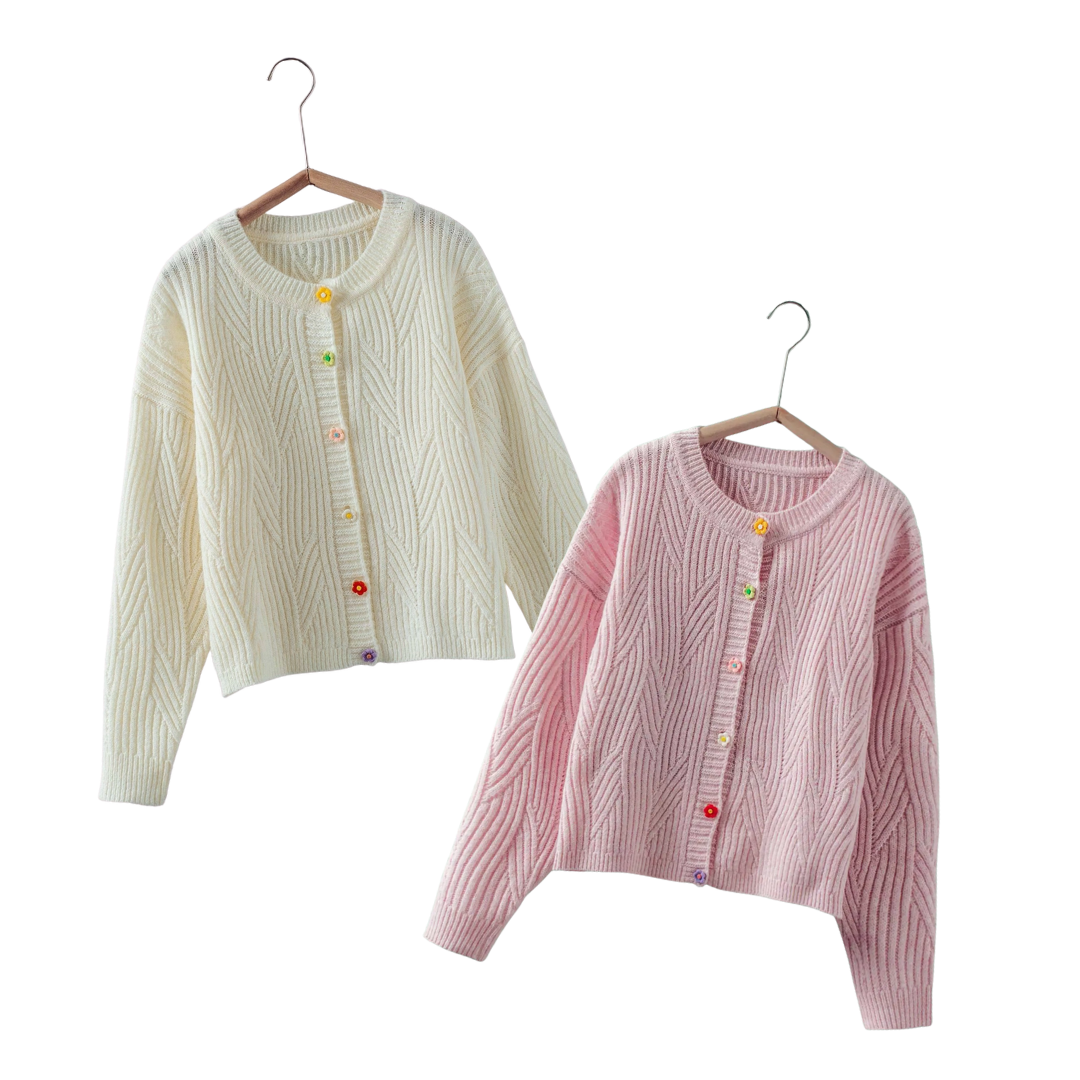 Flower Button Textured Knit Cardigan — Soft Layers, Happy Details