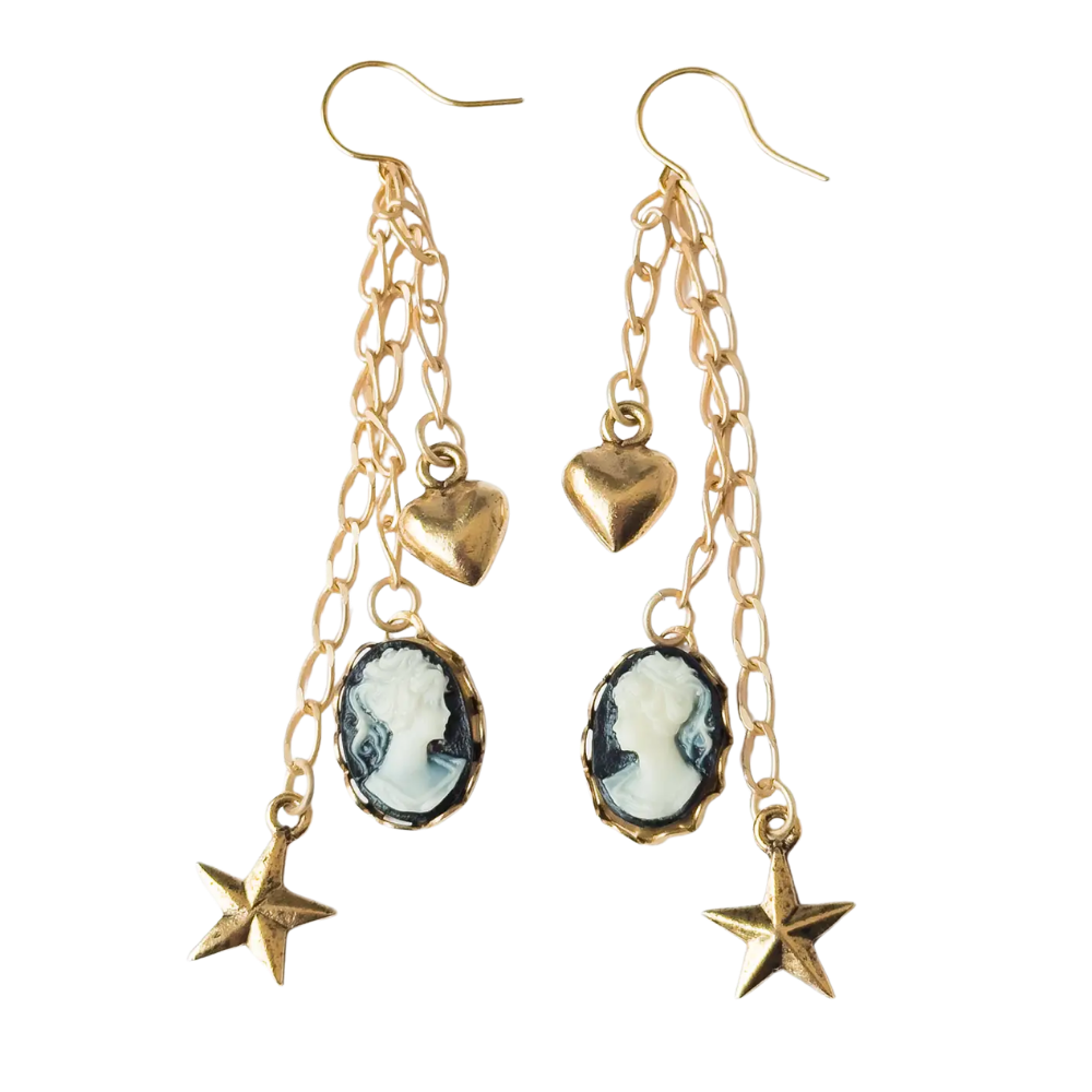 Long Cameo Charm with Heart, Star & Gold Chains Earrings