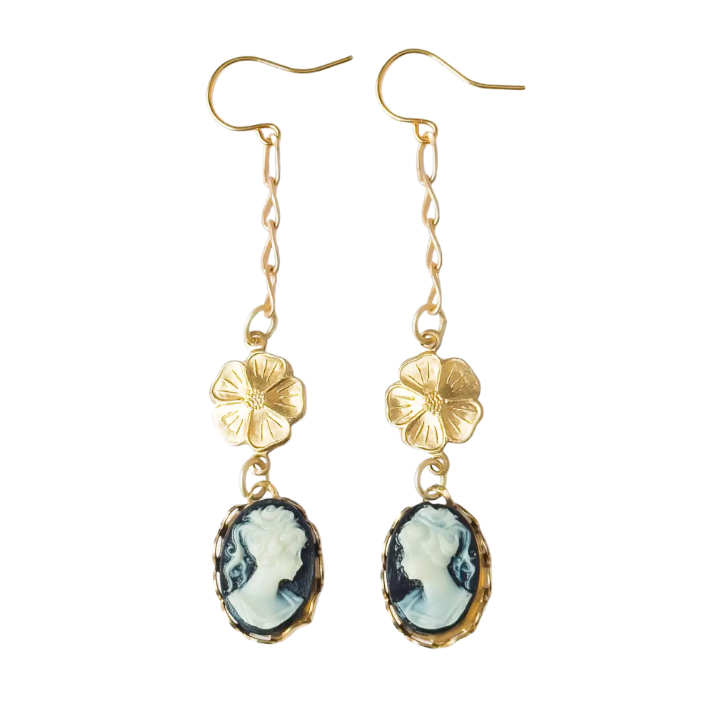Long Cameo Drop with Satin Gold Chain and Flower Earrings