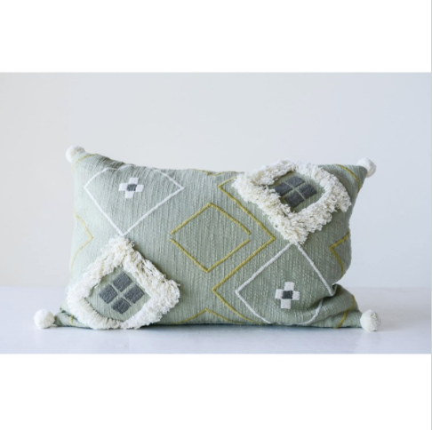 Cotton Woven Embroidered Pillow w/ Fringe & Pom Poms, Sage Color
