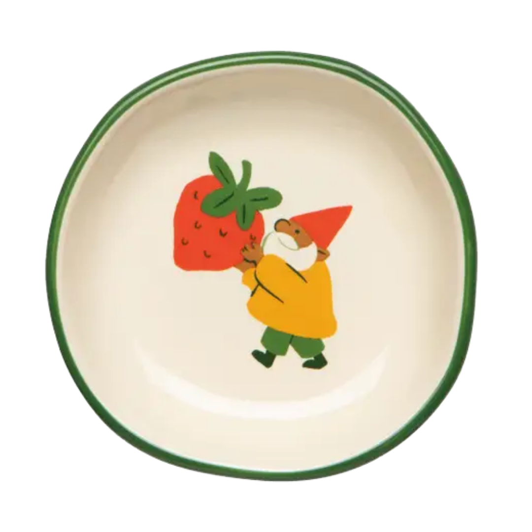 A charming little set for salt, spices, dips, or tiny treasures, these stoneware pinch bowls bring a touch of storybook whimsy to the table. Featuring the sweet Gnome Grown design with red-capped gnomes, snails, and blooming garden details, they add a playful feel to everyday cooking and snacking.