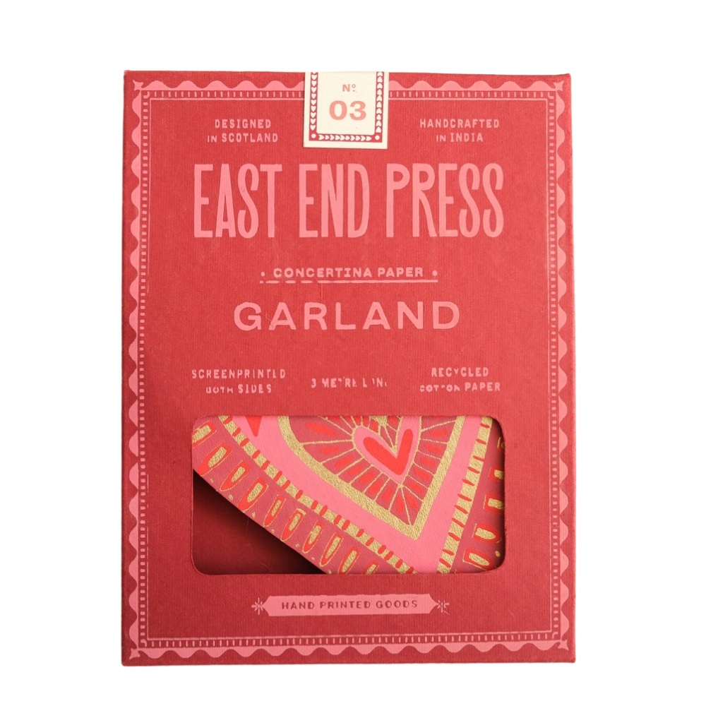 Measuring three metres long, the garland is made up of four repeating heart designs across 20 shapes, creating a rhythmic, eye-catching display. Each piece is screen printed by hand on both sides by talented artisans in Jaipur and thoughtfully crafted from recycled materials.